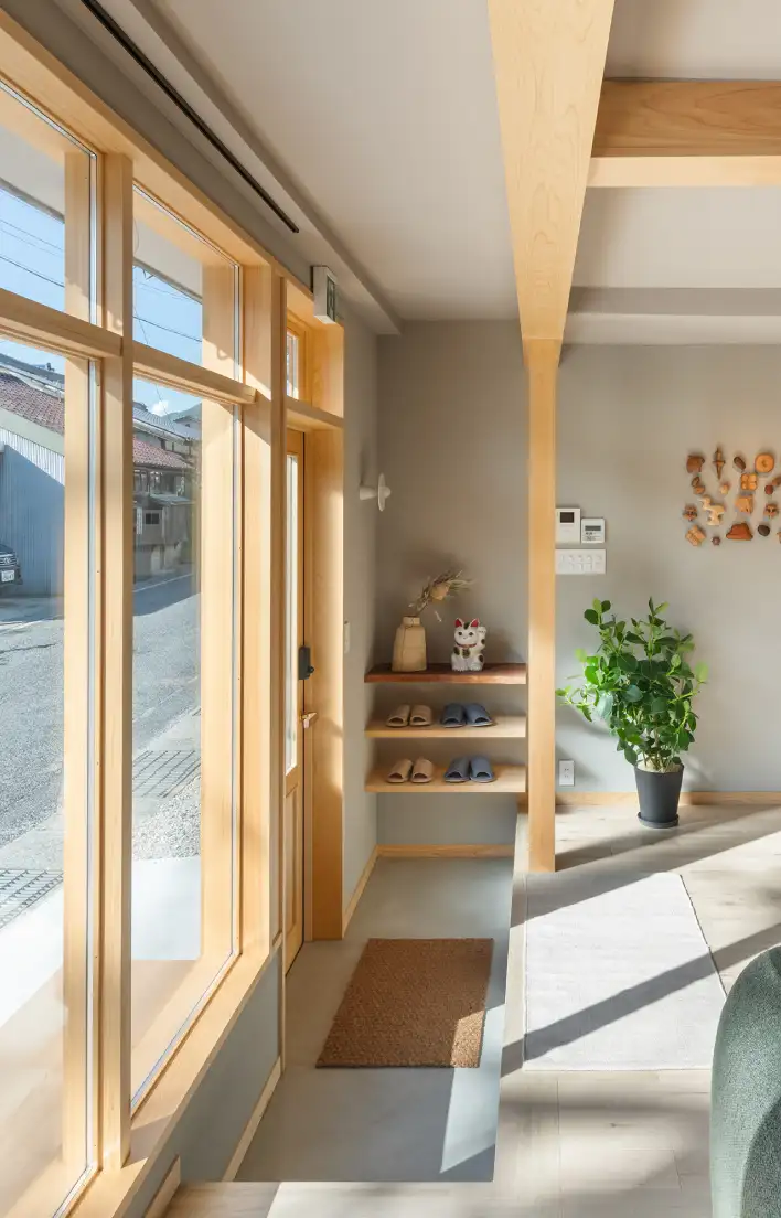 The soft beige of Kiso hinoki cypress matures over time into a rich amber tone, giving the building its distinct character. New hinoki elements—like the entrance door and window frames—respond in harmony to this warmth, revealing both the beauty shaped by time and the living spirit of the wood.