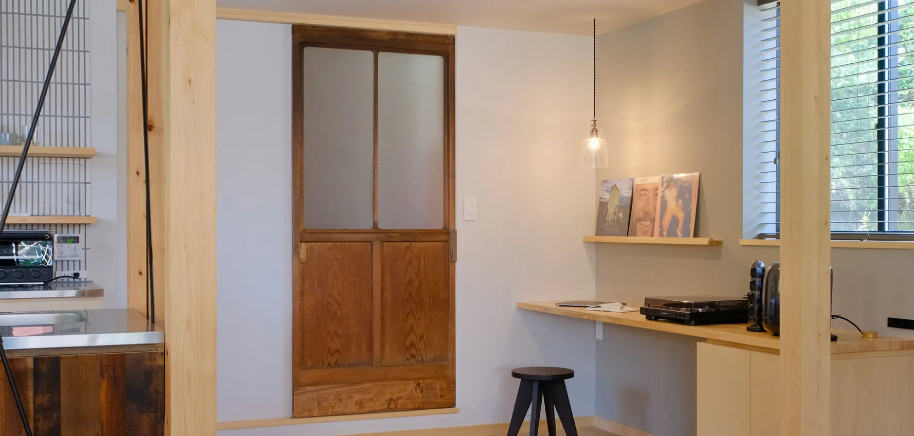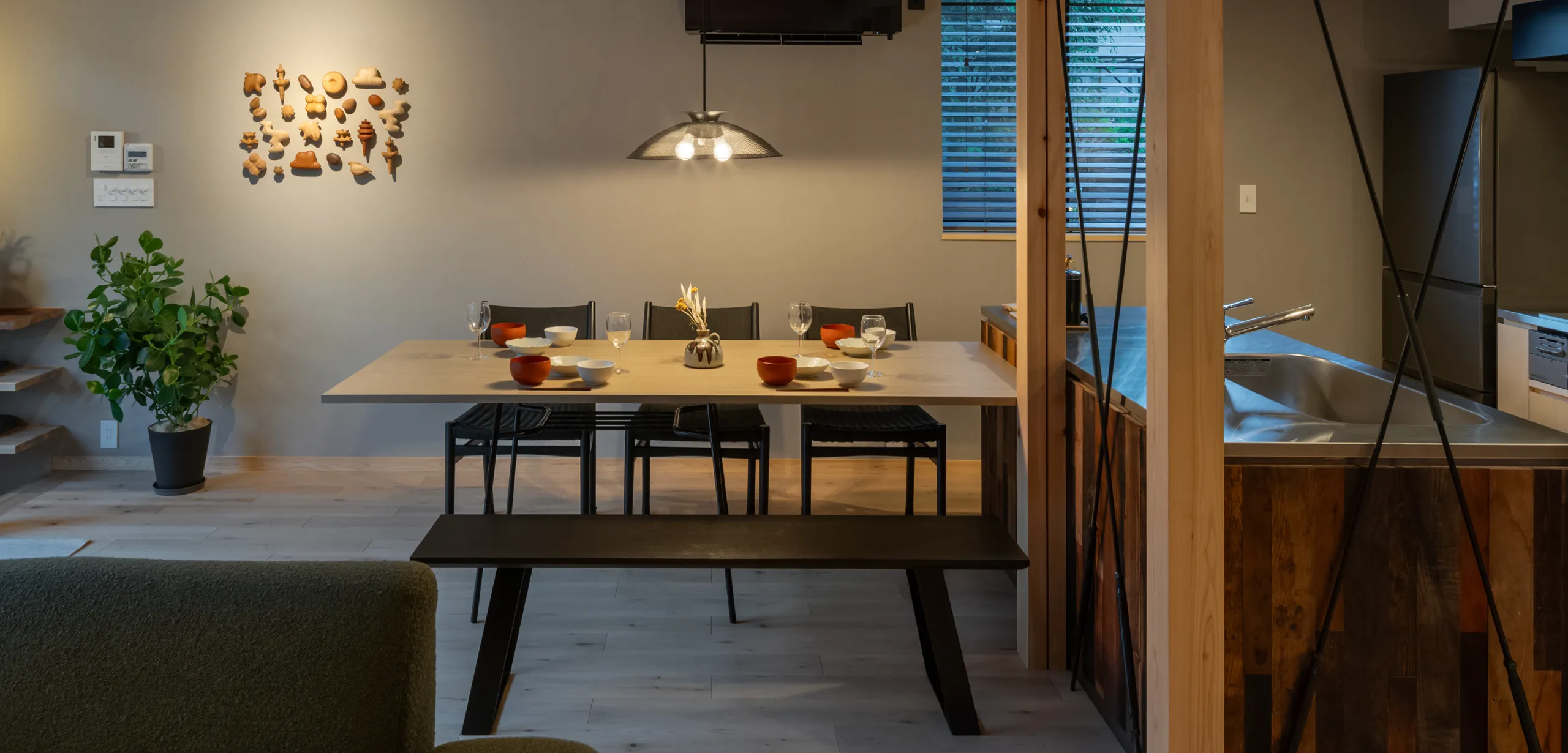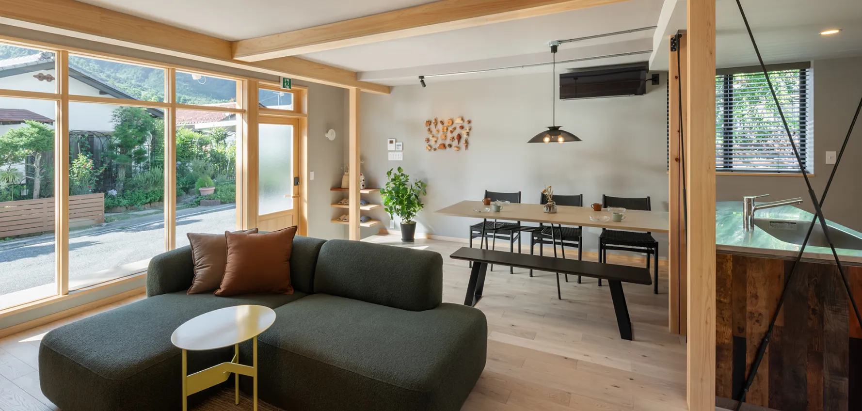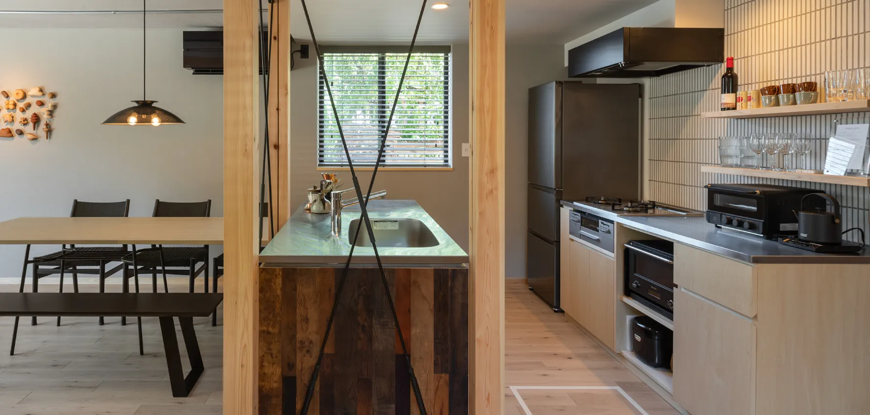 キッチンとひと続きのダイニングには、6人がゆったりと座れるテーブルを設置。県内で手に入れた古材やヴィンテージライトが空間のアクセントに。食事や会話を囲んで、思い思いの時間をお過ごしください。