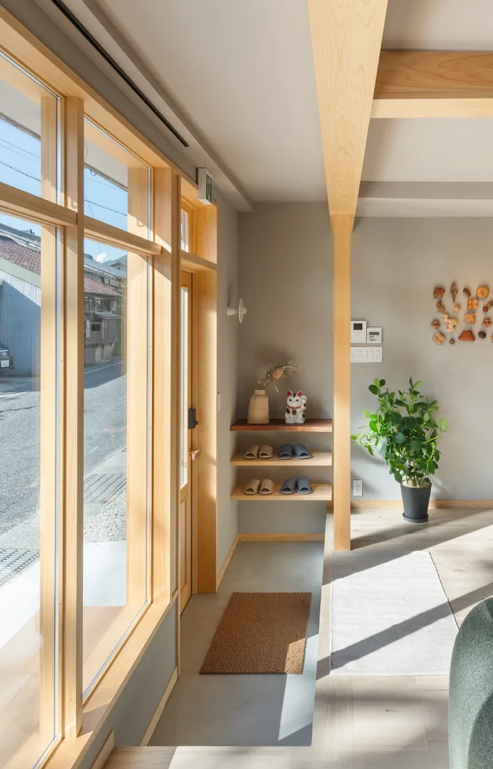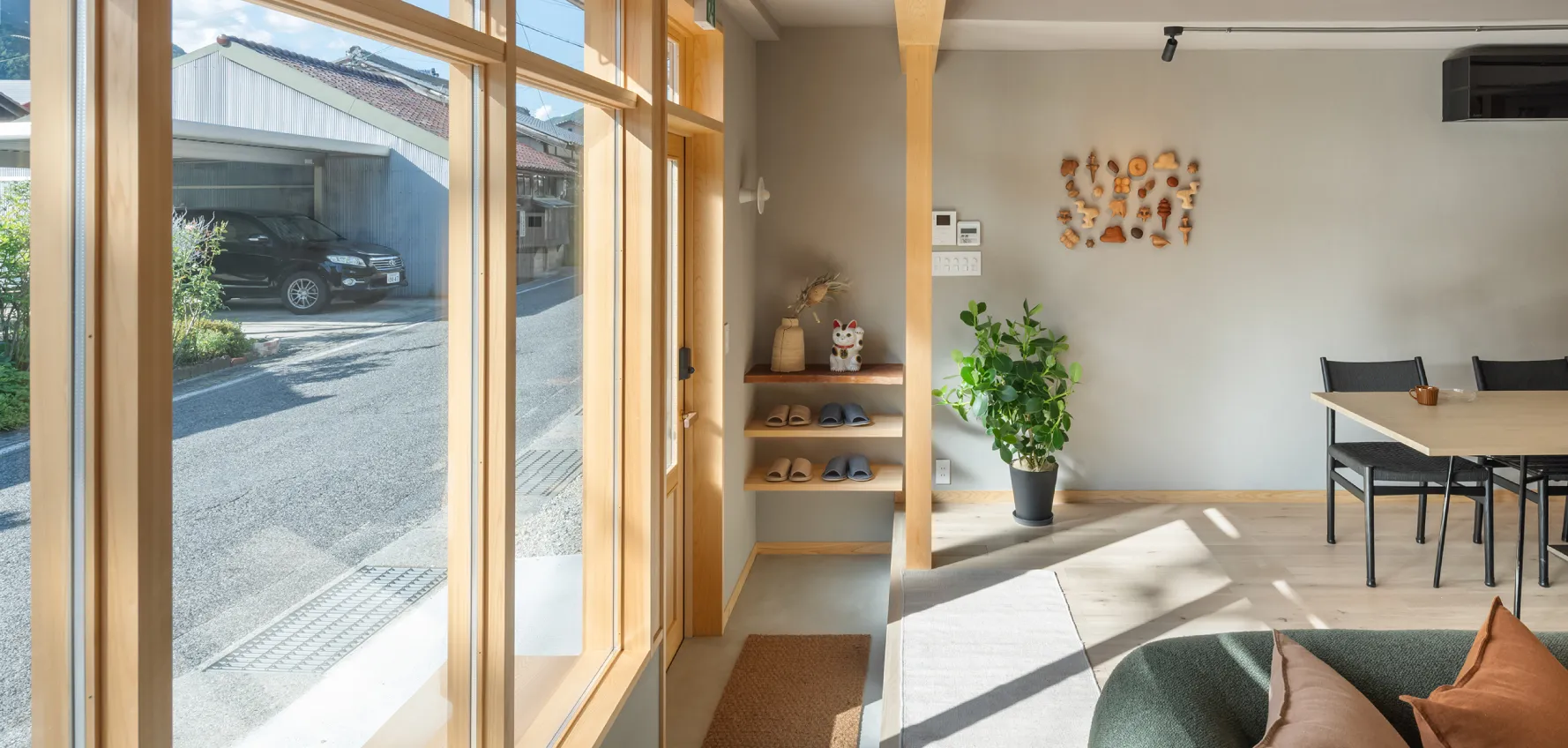 かつて車庫だった場所を、街に向かって開かれたリビングに再構成。旅人を迎え入れるリビングとして再生された空間には、かつて人とモノが行き交った名残が静かに息づいています。