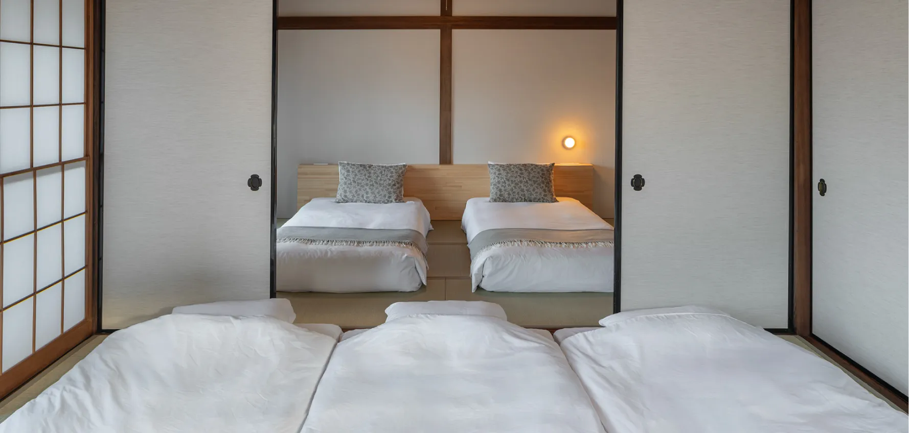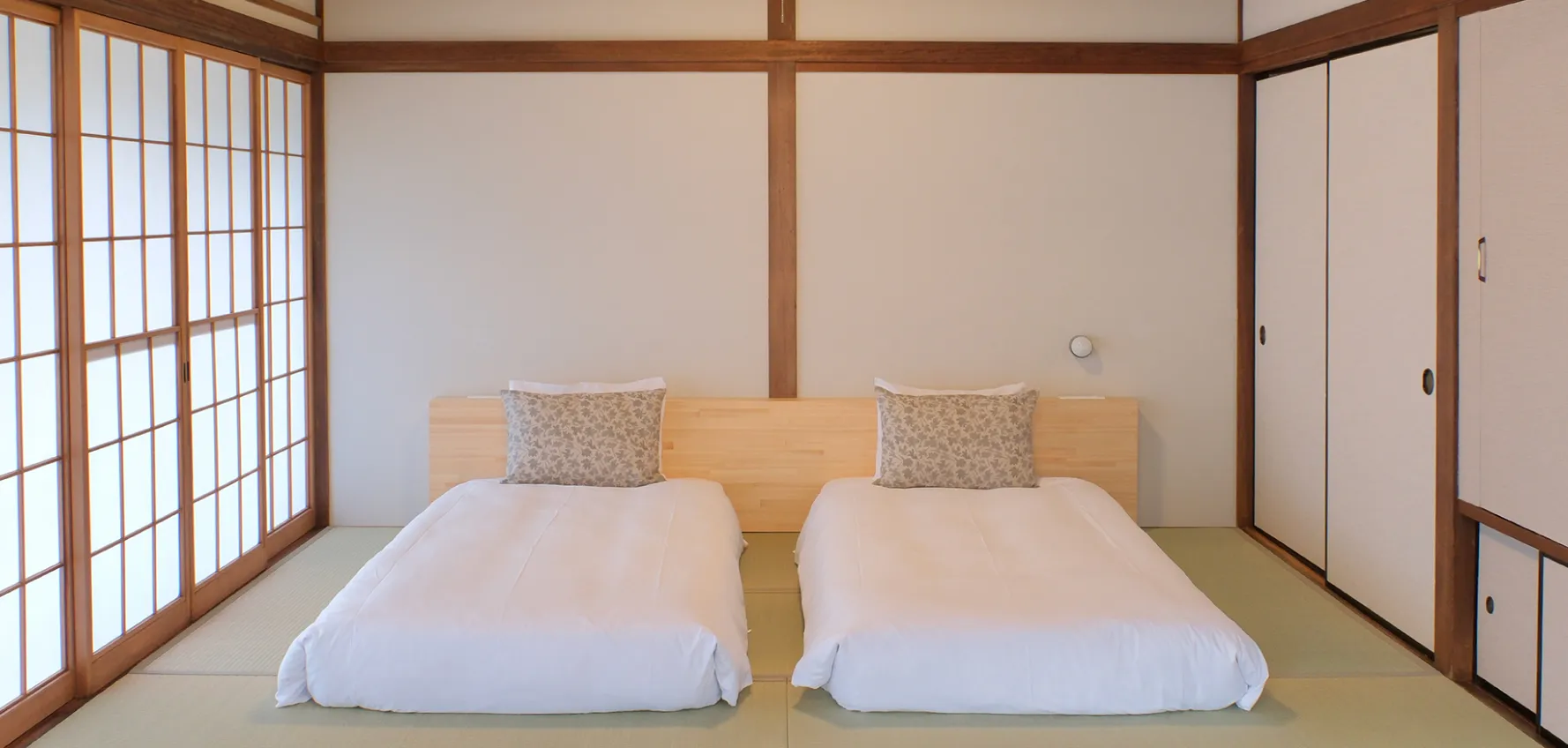 木曽ヒノキに包まれた、趣あるツインベッドルーム。シングルベッドが2台並び、ゆったりとお休みいただけます。隣の和室・大と続き間としても利用可能。新たに設えたヘッドボードは、読書灯や飲み物などの小物置きとしても便利です。