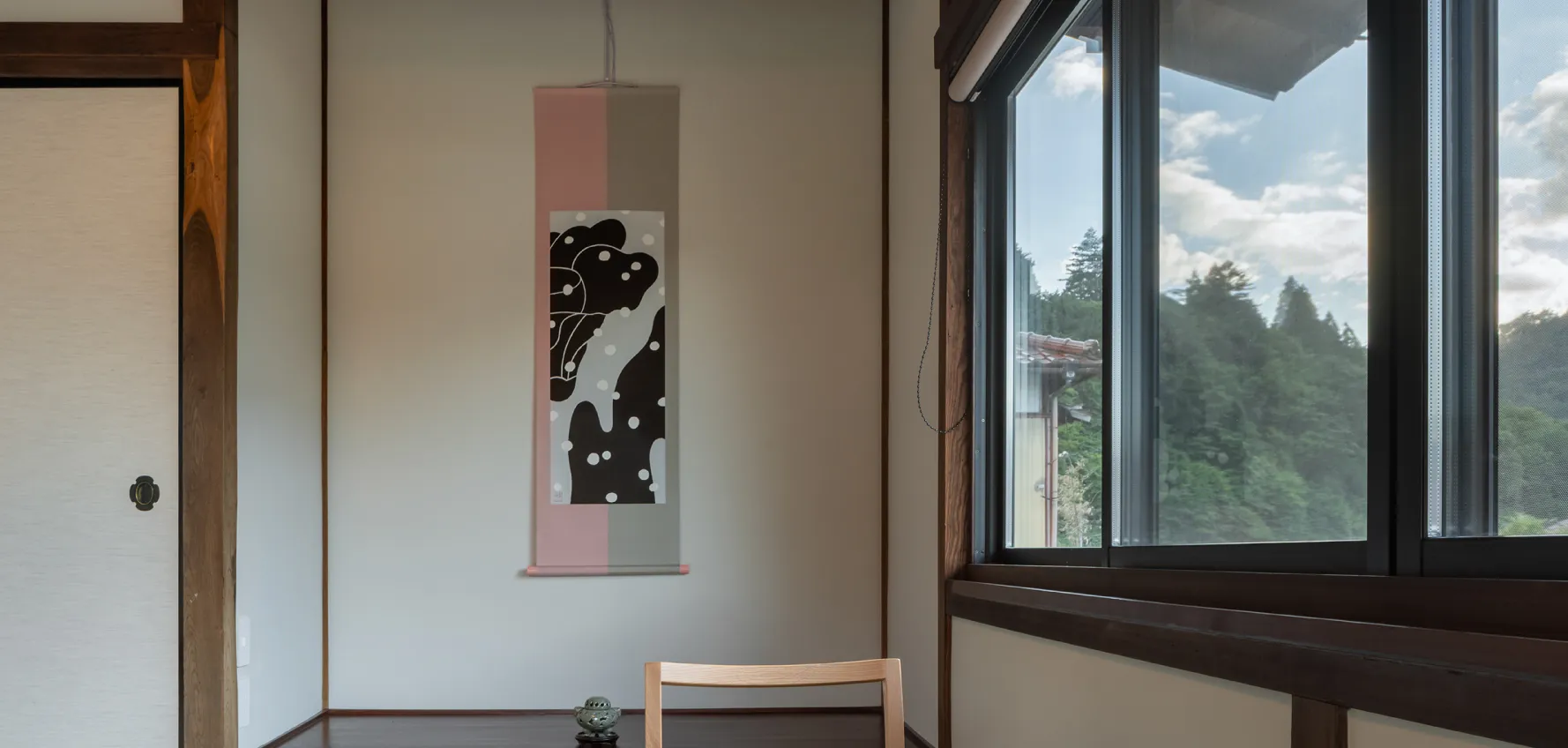 日本家屋に欠かせない床の間が、この家にも静かに存在しています。壁にはモダンな掛け軸が配され、伝統と現代が心地よく溶け合う空間をつくり出しています。