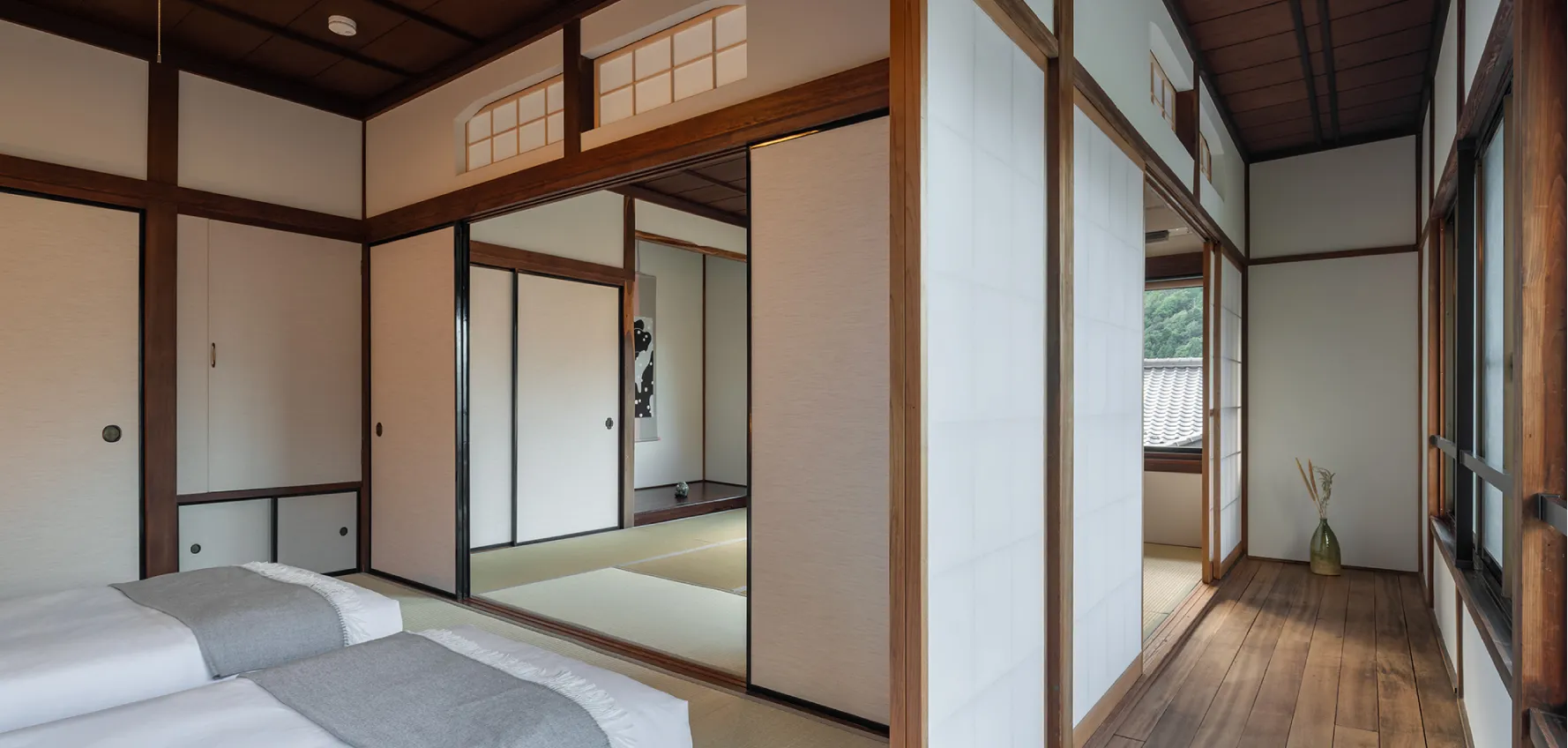 建具や欄間を開け放てば、和室と廊下がひとつながりの空間に。視線が奥まで抜け、家全体に広がりと趣が生まれます。和の美しさがふんわりと漂う、ゆるやかな時間が流れています。