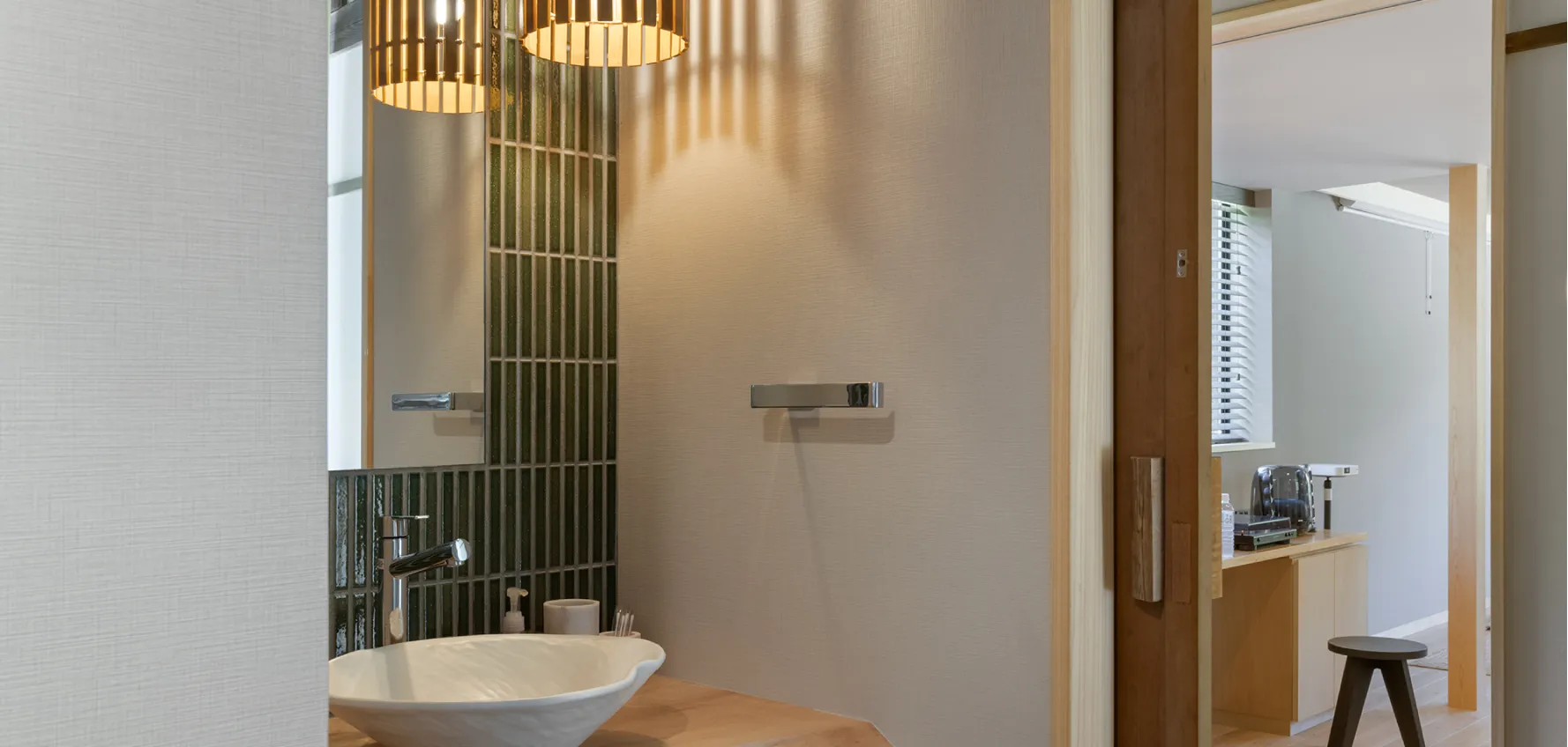 この宿には洗面台が2つ。大人数でも同時に身支度ができ、朝のお出かけ前も安心です。栃の洗面台と、木曽の森をイメージした深緑色のタイル。小さな空間にもこだわりました。