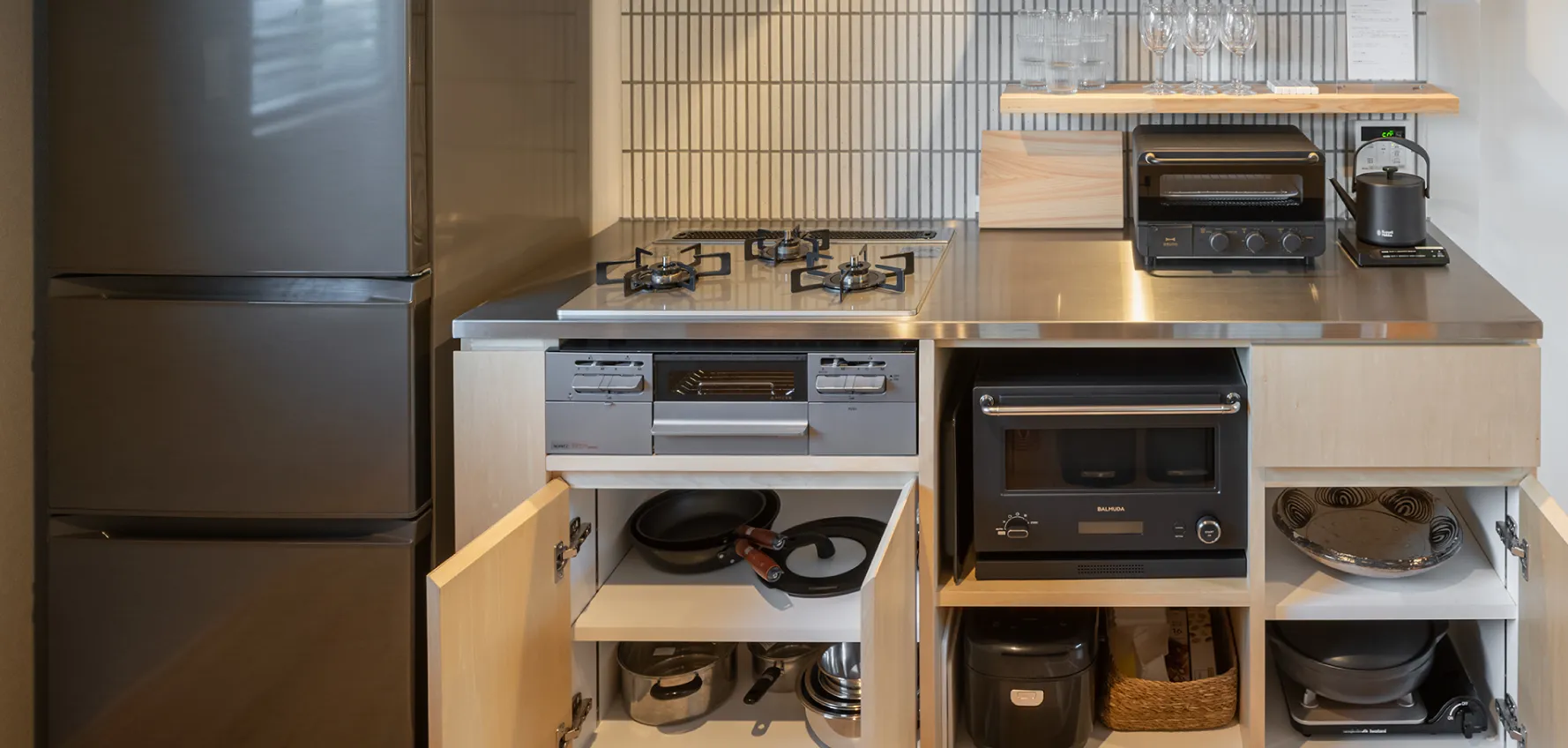 3口コンロ、魚焼きグリル、オーブンレンジ、トースター、炊飯器、ケトルなど、調理に必要な器具を一通り揃えました。カセットコンロや土鍋もあるので、テーブルで鍋料理も囲めます。旅先での調理も、気軽に・快適に過ごせるよう整えています。
