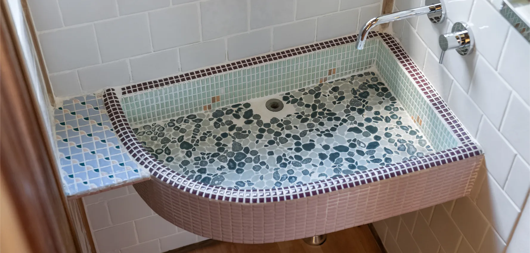 昭和の時代、職人たちが一つひとつ手づくりで仕上げていた、モザイクタイルの洗面ボウル。色鮮やかな小さなタイルでかたどられた、一点ものです。その貴重な痕跡を、大切に残しました。
